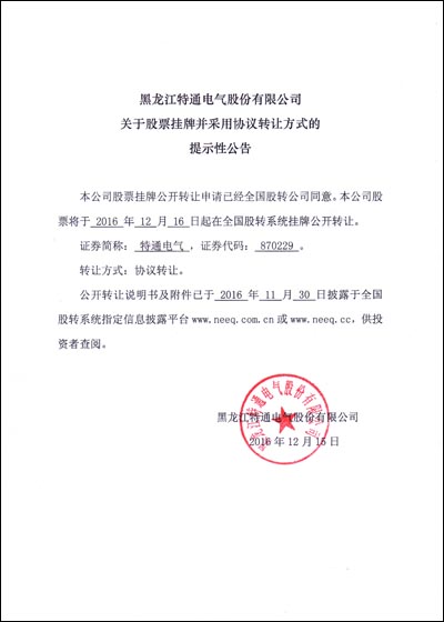 黑龍江特通電氣股份有限公司于2016年12月16日在全國中小企業(yè)股份轉(zhuǎn)讓系統(tǒng)(新三板)掛牌公開轉(zhuǎn)讓,證券簡稱:特通電氣,證券代碼:870229。特通電氣在全國中小企業(yè)股份轉(zhuǎn)讓系統(tǒng)成功掛牌,標志著公司正式進入資本市場,開啟了公司發(fā)展的新篇章。